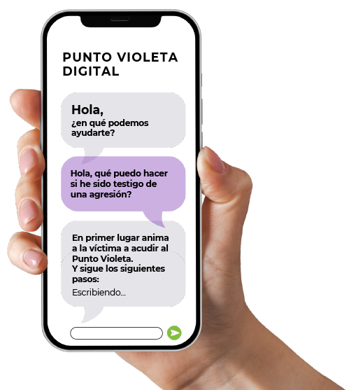 Busca nuestro código QR en los carteles que encontrarás dentrodel recinto. Con él tendrás acceso de forma rápida y eficaz, a través de tu dispositivo móvil, a un chat que te ofrecerá la información necesaria, además de ofrecerte ayuda y acompañamiento para acudir al Punto Violeta situado dentro del recinto.